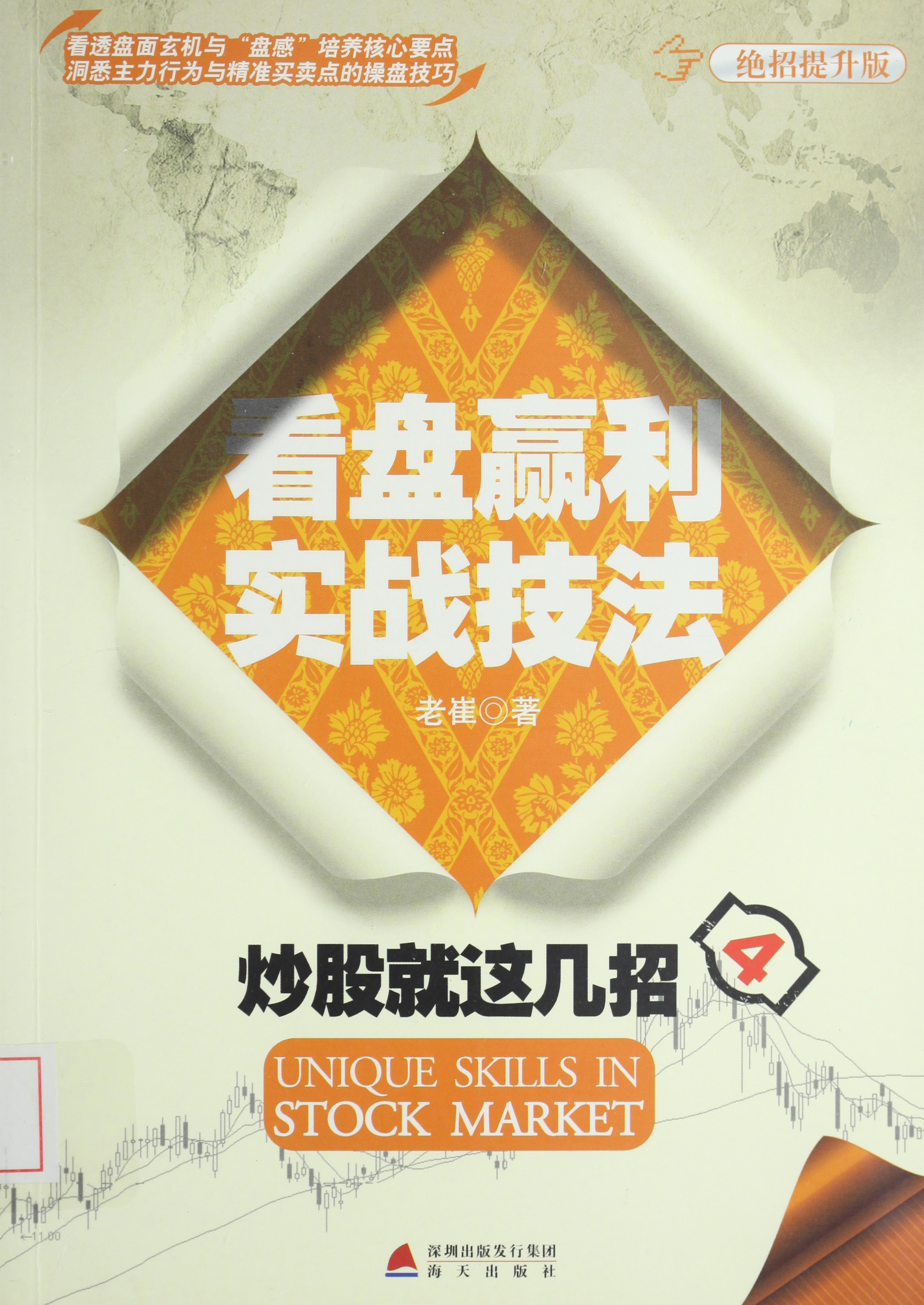 封面英文共同题名:Unique skills in stock market。 本书分析总结了短线盘口语言,分时走势看盘技巧,盘口异动看盘技巧,量价关系看盘技巧、庄家动作和盘中变化看盘技巧,其中,令股民困惑的盘中各时段变化和庄家的各种动作,也给予了解析。